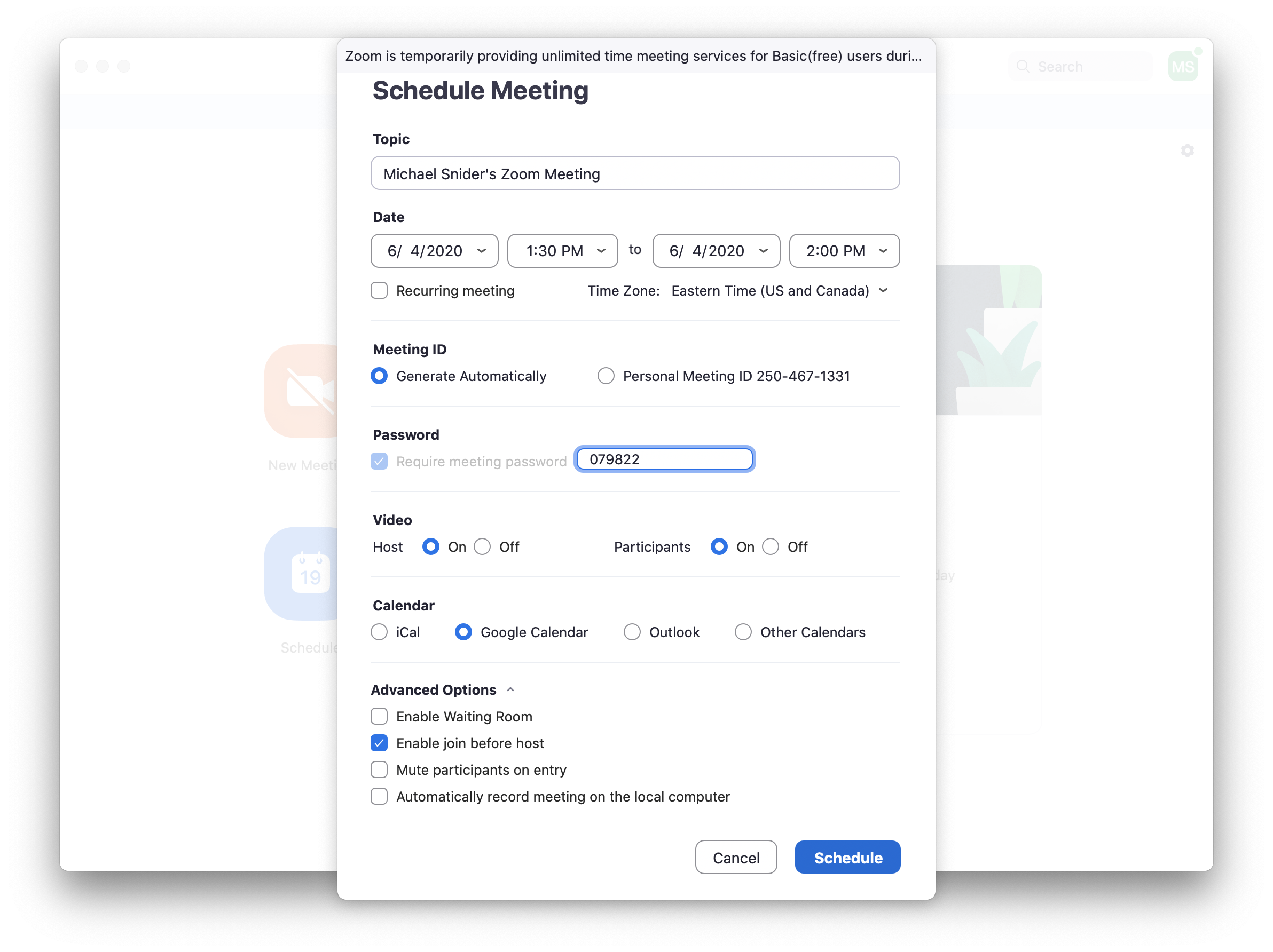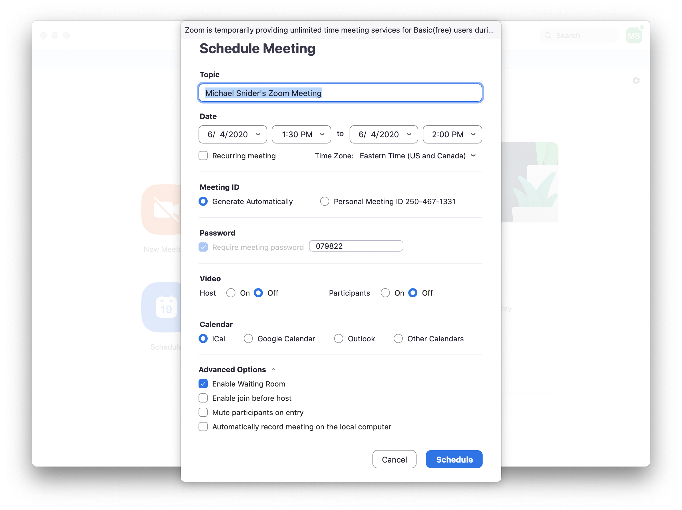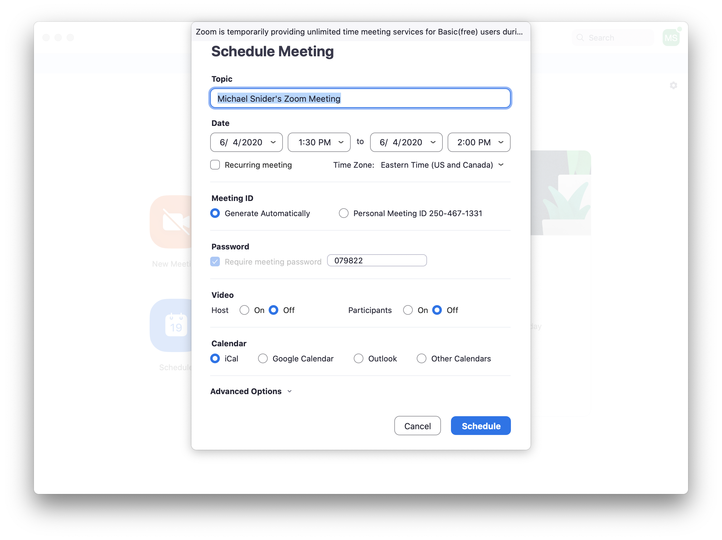 Michael Snider is inviting you to a scheduled Zoom meeting.Topic: Michael Snider's Zoom MeetingTime: Jun 3, 2020 02:00 PM Eastern Time (US and Canada)Join Zoom Meetinghttps://us02web.zoom.us/j/85694196924?pwd=somestringMeeting ID: 123 1234 1234Password: 123456